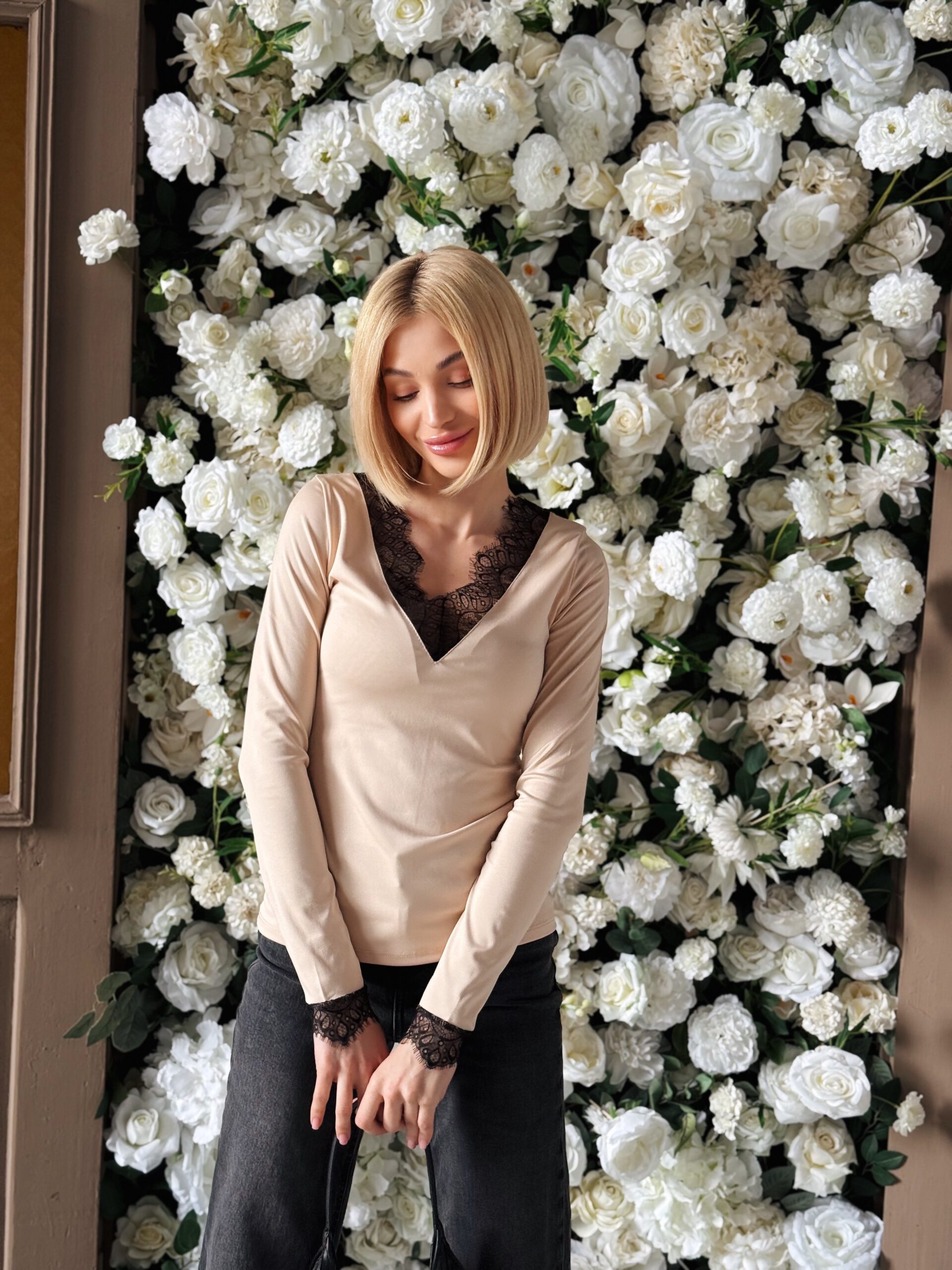 • V-подібний виріз декольте витончено відкриває зону шиї, а довгі рукави й лінія вирізу прикрашені ніжним мереживом, що додає образу елегантності та легкої спокусливості.