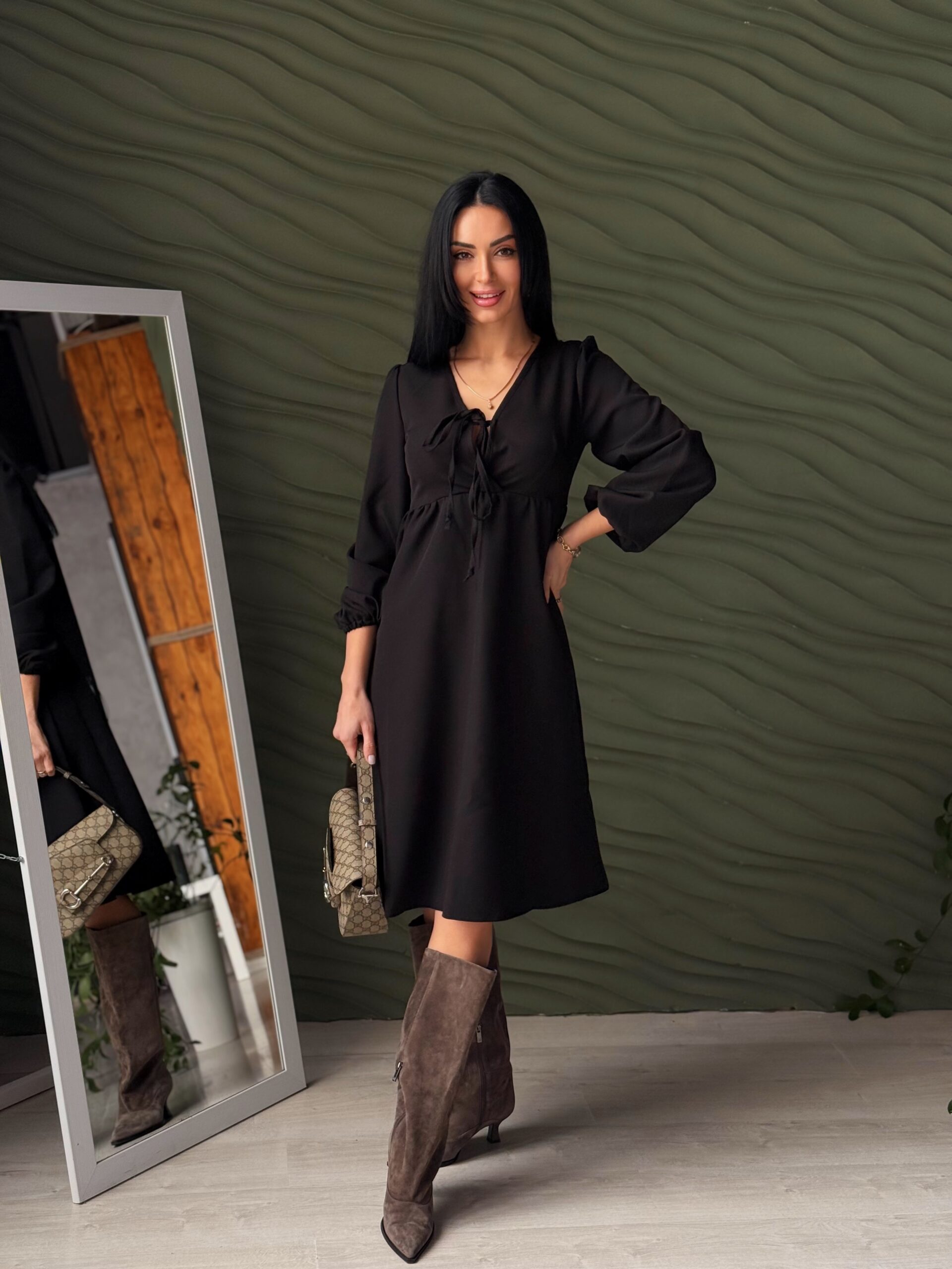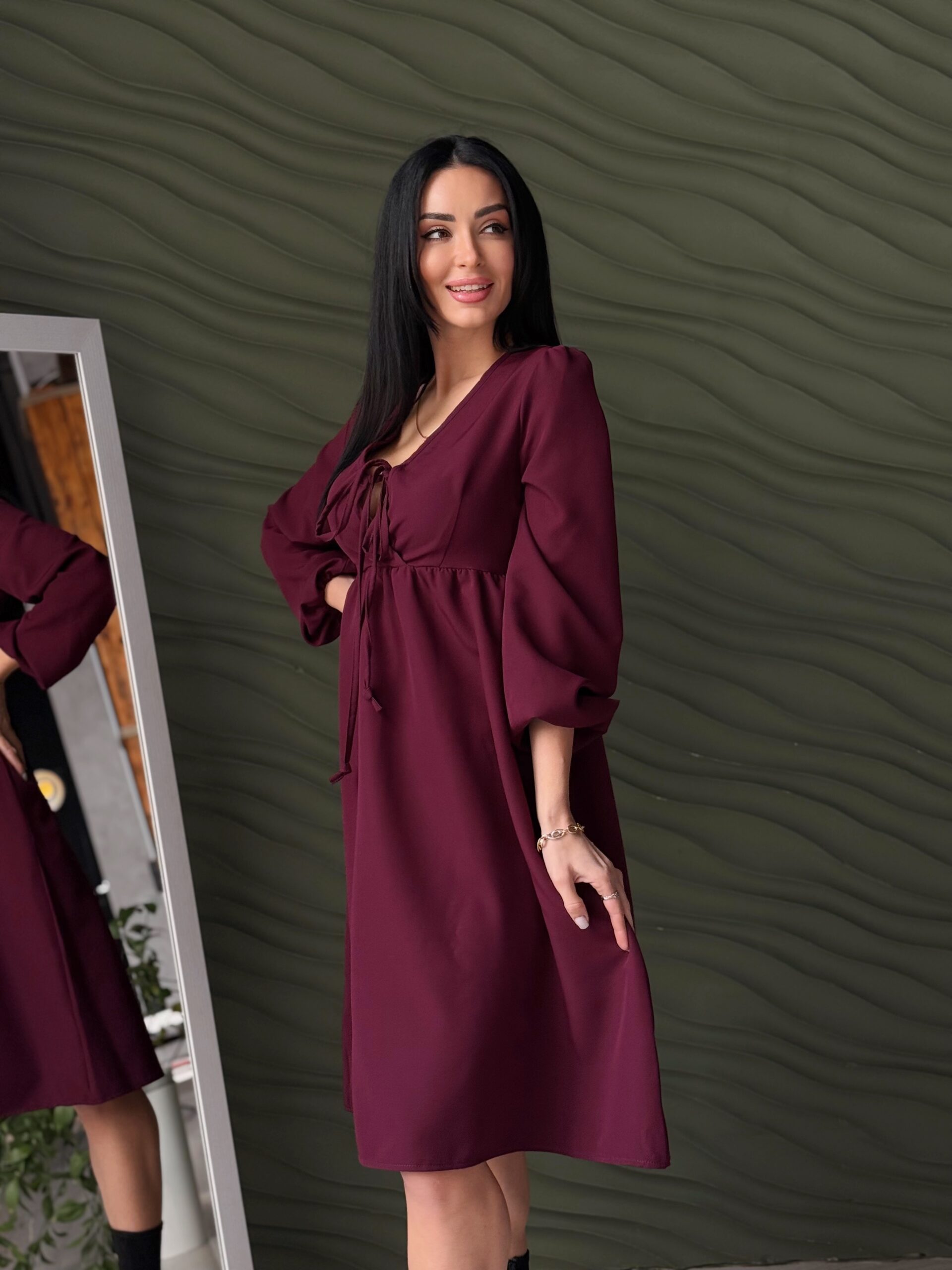 - V-подібний виріз із зав’язкою додає моделі витонченості та робить образ більш легким і сучасним.